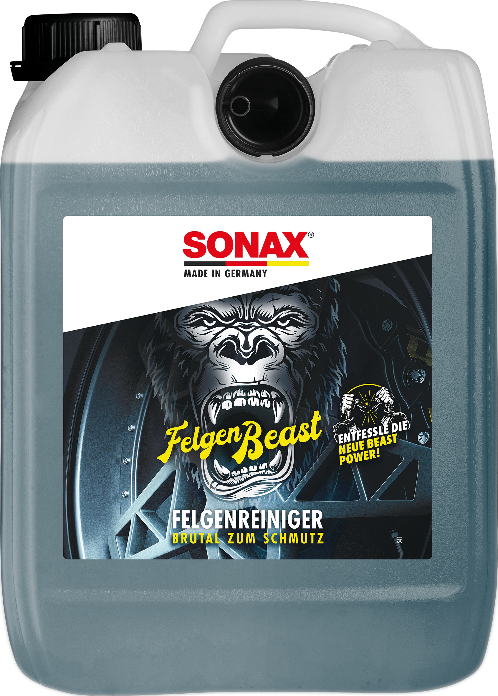 Flasche schütteln. Sprühdüse durch Drehen öffnen – los geht es! Erst an einer unauffälligen Stelle auf Materialverträglichkeit prüfen. Nicht auf nachlackierten Felgen anwenden. Reiniger aus kurzer Distanz satt und gleichmäßig auf die abgekühlte Felge sprühen. 3–5 Minuten einwirken lassen. Besonders biestigen Schmutz mit einer Bürste z. B. SONAX Microfaser FelgenBürste (Art.-Nr. 04179410) lösen – geeignete Schutzhandschuhe tragen. Mit kräftigem Wasserstrahl oder Hochdruckreiniger gründlich abspülen.