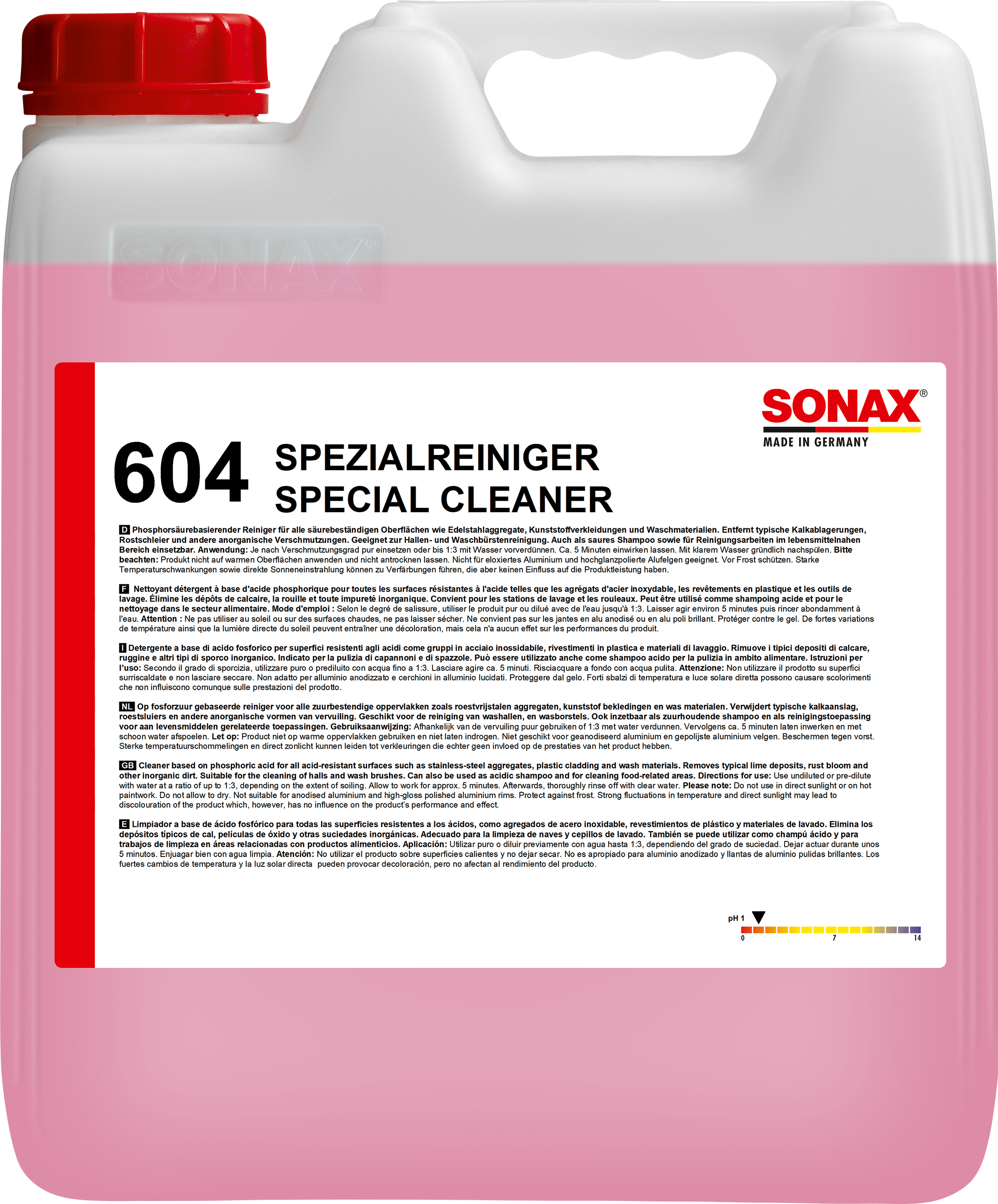 Unverdünnt anwenden oder bis 1:3 mit Wasser verdünnen und mit z.B. SONAX DruckpumpZerstäuber für saure und alkalische Produkte verarbeiten. Je nach Verschmutzungsgrad 5-10 Minuten einwirken lassen. Stark verschmutzte Teile mit Bürste, Schwamm oder Reinigungspad nachbehandeln. Anschließend mit klarem Wasser gründlich nachspülen.