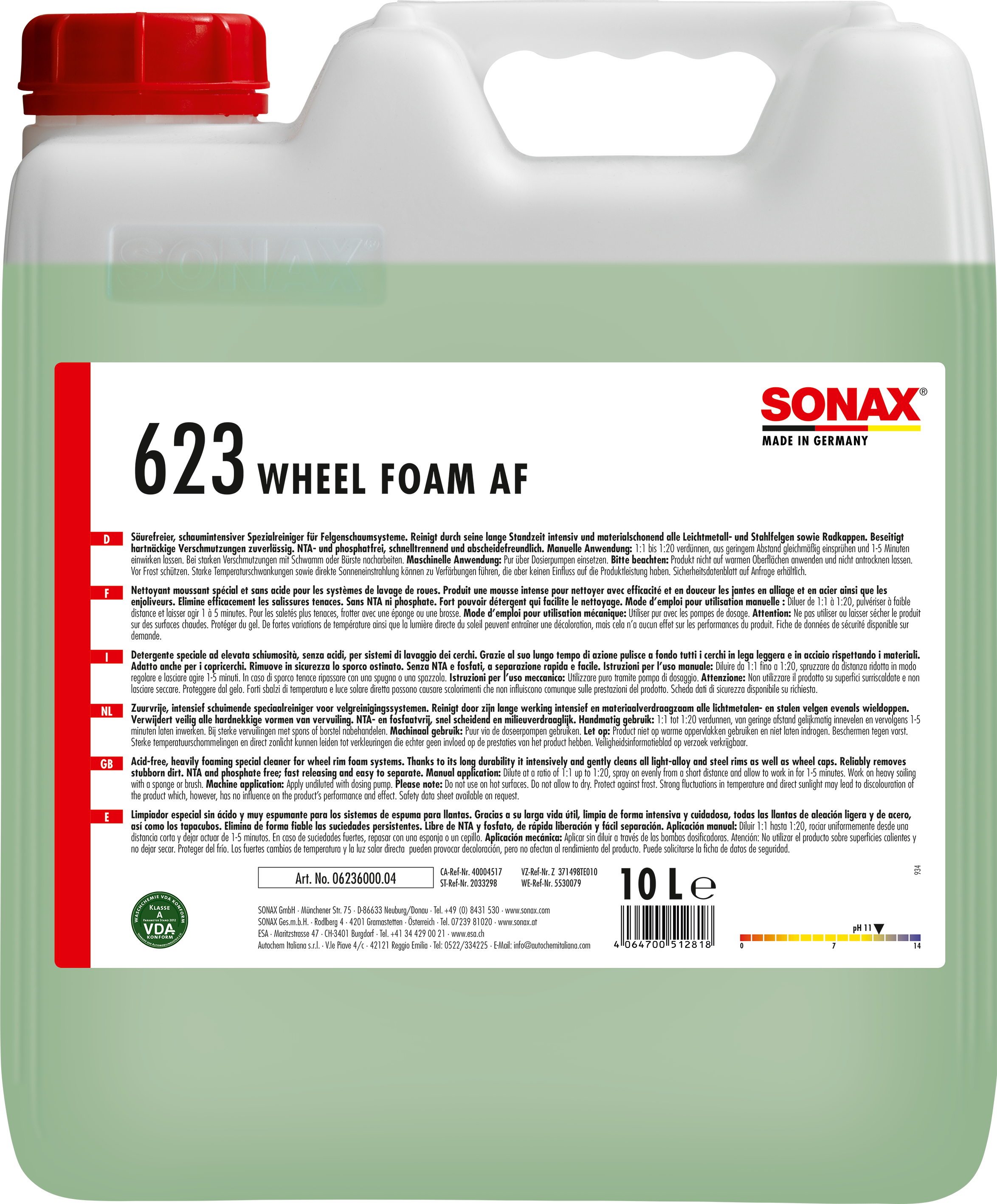 Maschinelle Anwendung: Pur über Dosierpumpen einsetzen. Bei Felgenschaumsystemen mittels Luft-/Wassergemisch sowie Chemieeinstellung das optimale Schaumbild erzeugen. Manuelle Anwendung: 1:5 bis 1:20 verdünnen, aus geringem Abstand gleichmäßig einsprühen und 1-5 Minuteneinwirken lassen. Bei starken Verschmutzungen mit Schwamm oder Bürste nacharbeiten.