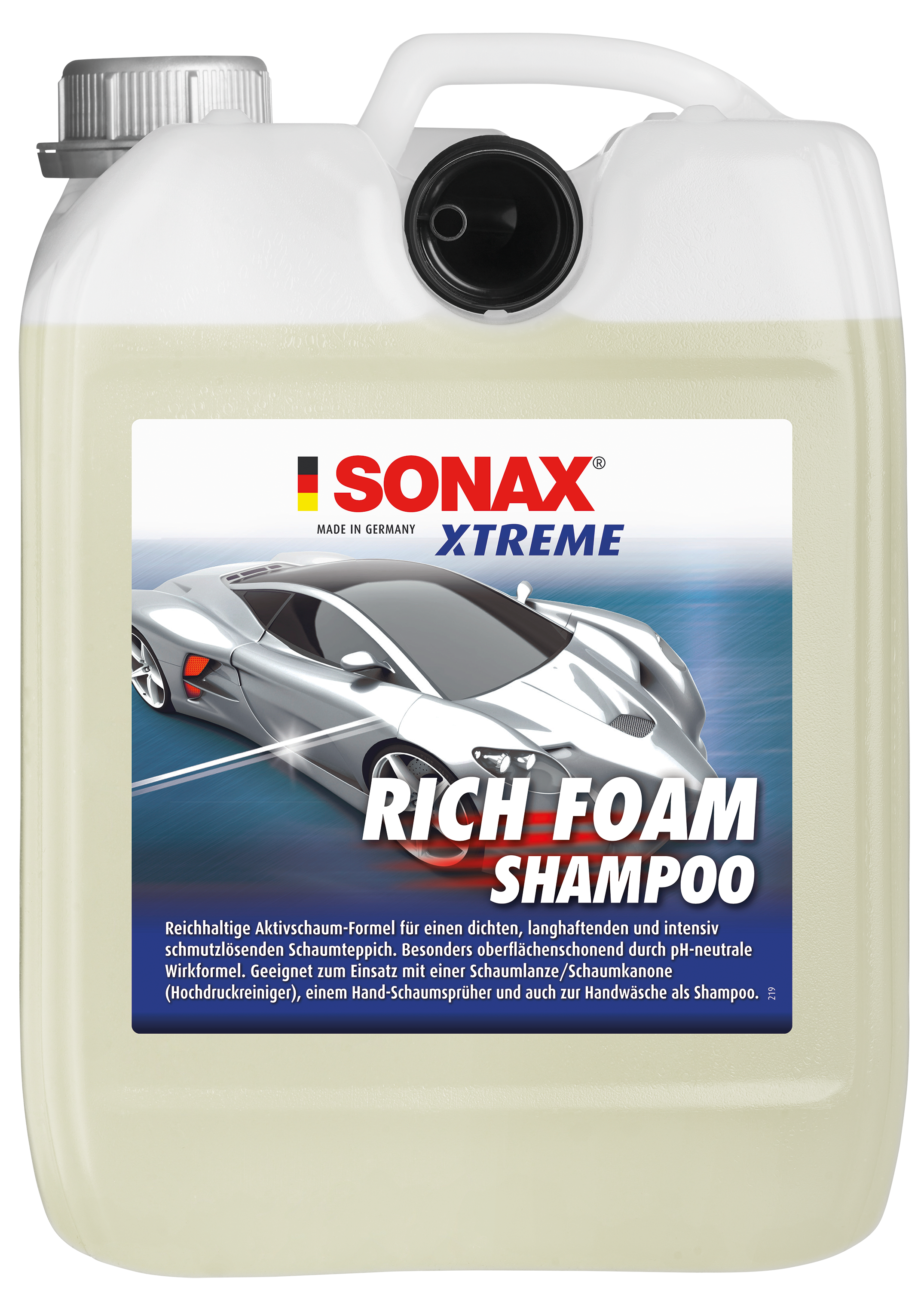 Stark verschmutzte Fahrzeuge vorher vom groben Schmutz befreien. Mit HD-Gerät und Schaumlanze: Je nach Gerät und Lanze 30-100 ml Shampoo mit 1l Wasser vorverdünnen und in den Vorlagebehälter der Schaumlanze füllen. Mit Hand-Schaumsprüher (z.B. SONAX FoamSprayer 1l, Art.Nr. 04965410): 10-30 ml Shampoo mit 1l Wasser im Behälter mischen (je nach Gerät und Düse). Handwäsche: 50 ml Shampoo (=2 Verschlusskappen) in 10 l warmem Wasser auflösen und aufschäumen. Fahrzeug von oben nach unten mit einem Schwamm waschen, Shampoo nicht antrocknen lassen. Anschließend mit klarem Wasser gründlich abspülen und abledern.