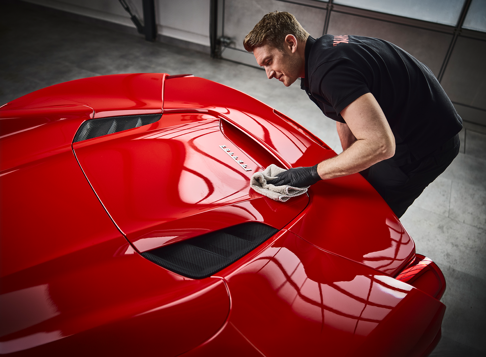 Maschine in Phase 1 mit etwas Druck langsam über den Lack führen. Bei Bedarf ankanten, um tiefe Kratzer besser glätten zu können
