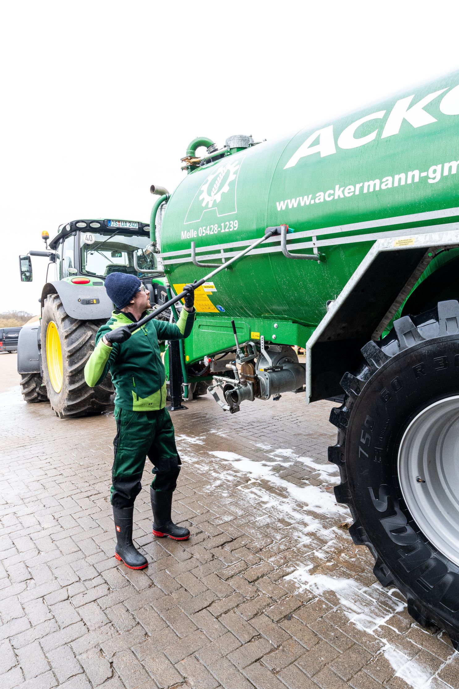 Das Aufbringen des Agrar „Schmutz Schutz“ ist im Nu erledigt und sollte vor jedem Einsatz bei dem gereinigten Fahrzeug erfolgen. Nach der eigentlichen Wäsche des Güllefasses beispielsweise mit dem Sonax Agrar Aktivreiniger wird die Versiegelung einfach im Niederdruckverfahren – im Idealfall geschäumt – auf das noch nasse Fahrzeug aufgebracht. Für die bessere Verteilung empfiehlt sich die Nacharbeit mit einer weichen Bürste. Anschließend wird mit klarem Wasser abgesprüht – somit ist das Güllefass schon nach wenigen Minuten perfekt versiegelt.